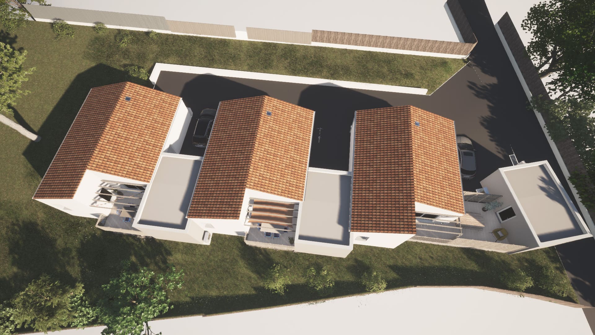 Ce projet concerne la construction de trois maisons individuelles destinées à un bailleur social, sur un terrain particulièrement complexe. Situé en cœur d’îlot et entouré de maisons pavillonnaires existantes, le site présente un fort dénivelé, rendant l’implantation des maisons plus complexe.